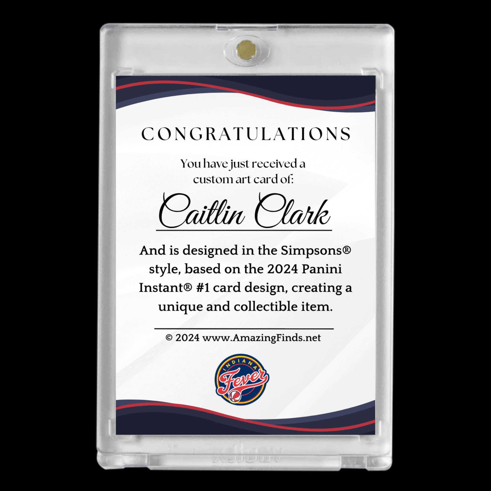 Celebrate Caitlin Clark’s incredible 2024 debut with this exclusive custom art card, featuring her in the iconic Simpsons® style and inspired by the 2024 Panini Instant® #1 design.