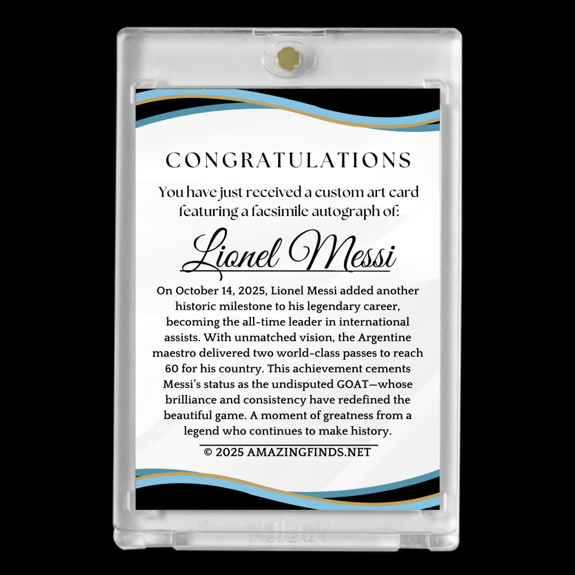 Celebrate a historic football milestone with this custom-designed art card honoring Lionel Messi, widely regarded as one of the greatest players of all time.