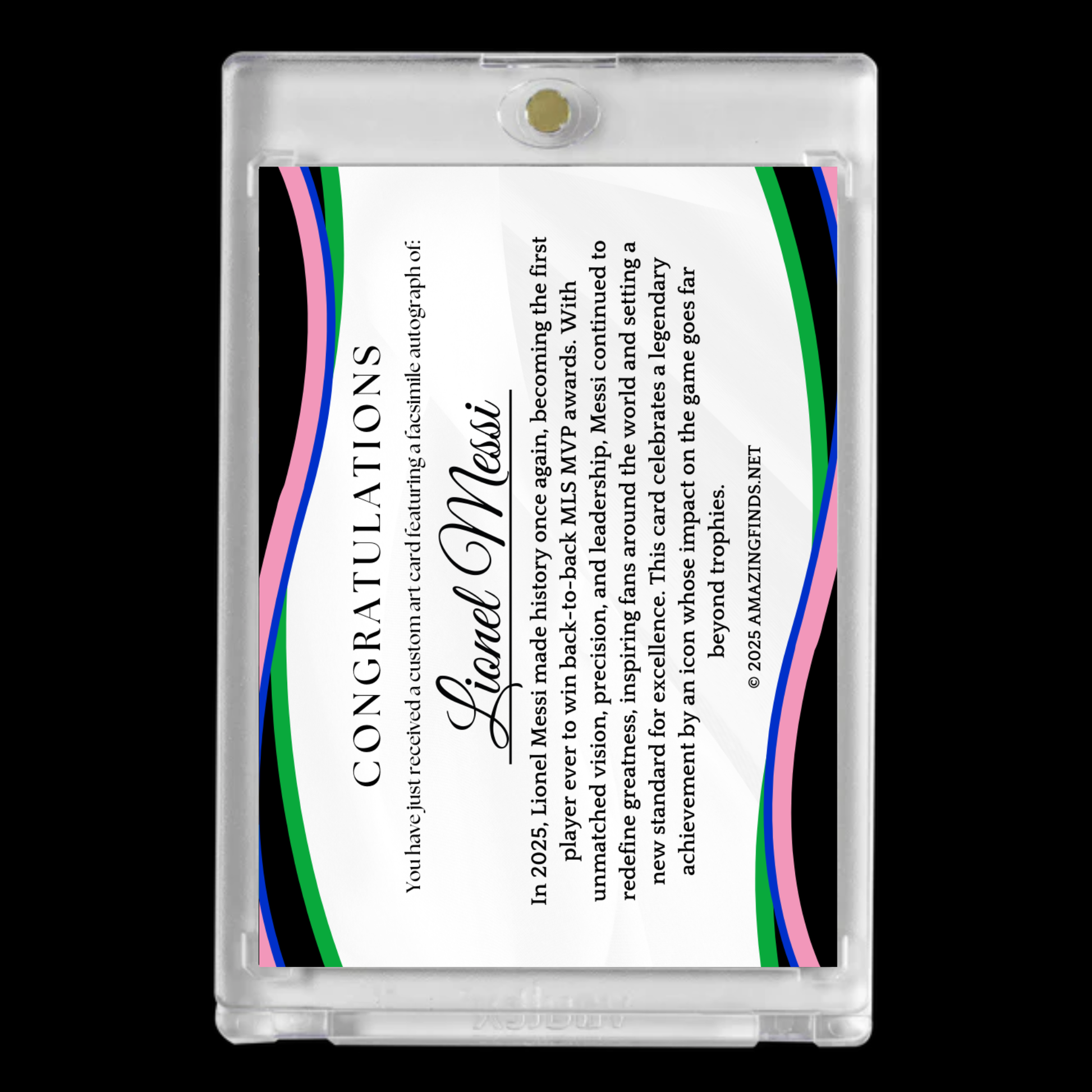 In 2025, Lionel Messi made history by becoming the first player ever to win back-to-back MLS MVP awards, continuing his legacy of excellence as captain of Inter Miami CF. This collectible art card honors his unmatched vision, precision, leadership, and global impact on the sport.