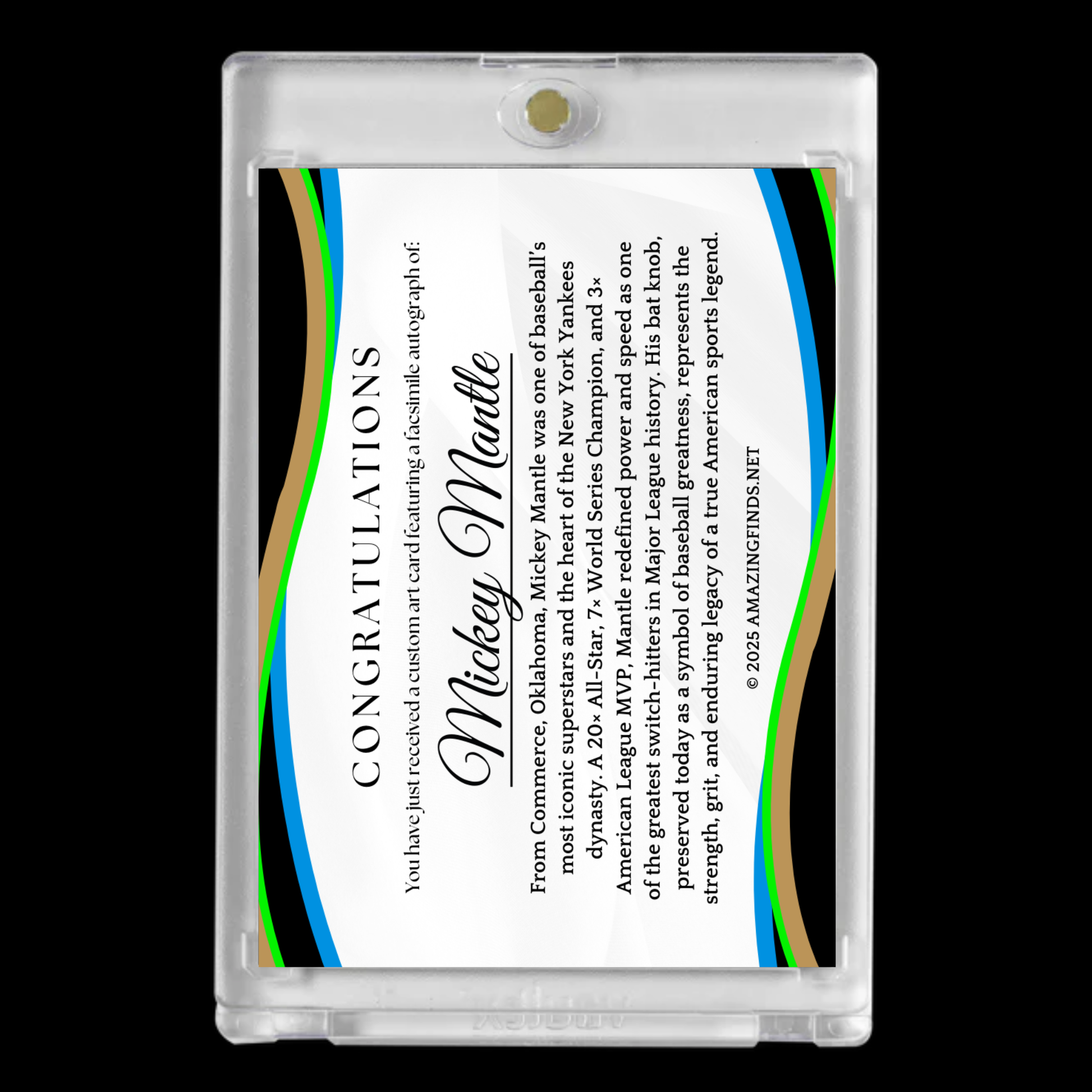 Celebrate the legendary career of Mickey Mantle, one of the most iconic players in baseball history. This exclusive custom art card honors the remarkable achievements and lasting legacy of the New York Yankees superstar.