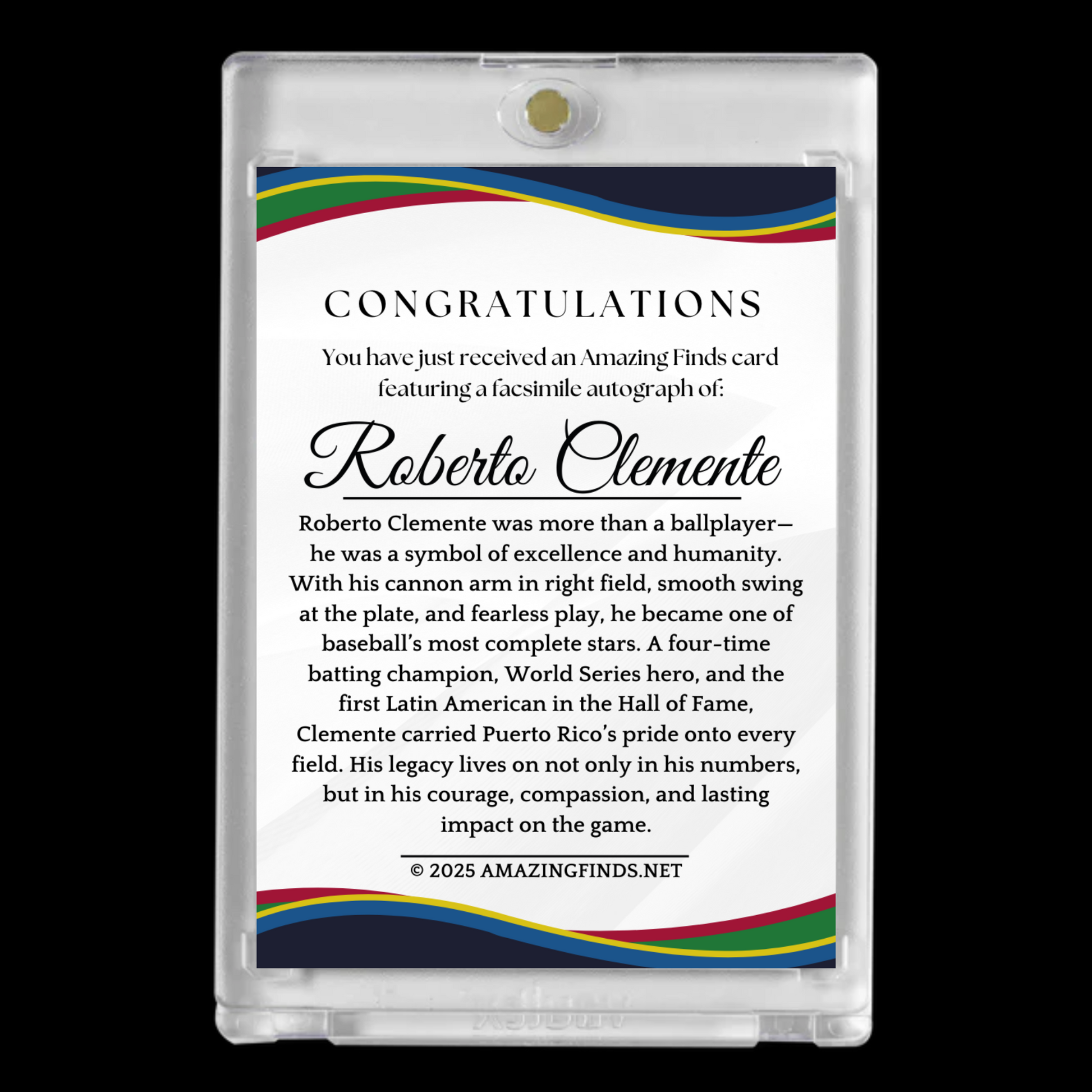 Celebrate the legacy of Roberto Clemente with this exclusive Amazing Finds collector’s card featuring his facsimile autograph.
