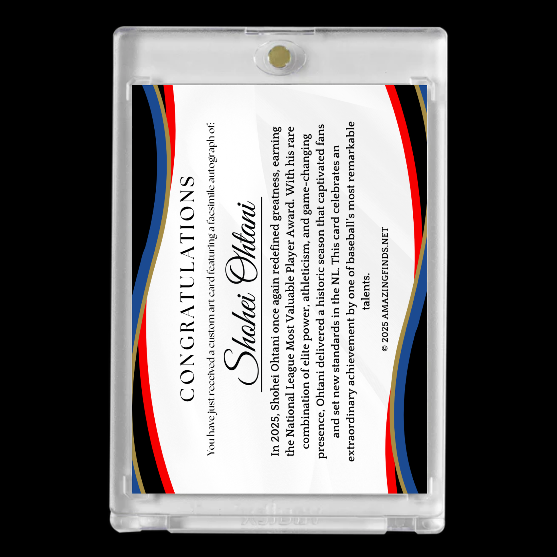 In 2025, Shohei Ohtani delivered a historic MVP-caliber season, earning the National League Most Valuable Player Award, redefining what it means to dominate the game. This premium art card was created for display, collecting, gifting, and fan appreciation.